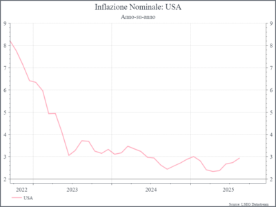In prospettiva, i policymaker americani dovrebbero effettuare altri due tagli entro la fine dell’anno, anche laddove l’inflazione dovesse avvicinarsi alla soglia del 3%, per poi fermarsi, a meno di un cambiamento significativo nel quadro macroeconomico e inflazionistico. Di seguito, il grafico sull’andamento dell’inflazione nominale negli Stati Uniti mostra come i prezzi al consumo stiano crescendo a un ritmo più serrato rispetto a quanto sperato dalla Fed, sebbene non in maniera drammatica.