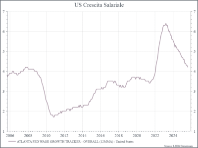 L’inflazione, però, non è l’unica variabile da tenere sotto osservazione: la Federal Reserve ha anche un mandato specifico rispetto all’occupazione. In una prospettiva storica, i livelli attuali del tasso di disoccupazione sono ancora contenuti, anche se si stanno gradualmente spostando verso l’alto. Parallelamente, la crescita dei salari rimane solida, sopra il 4% su base annua, un dato positivo per le famiglie e per i lavoratori, che continuano a recuperare parte del potere d’acquisto perso durante il picco inflazionistico del 2022, ma che rende più complesso il compito della Fed, impegnata a riportare l’inflazione vicino al 2%.