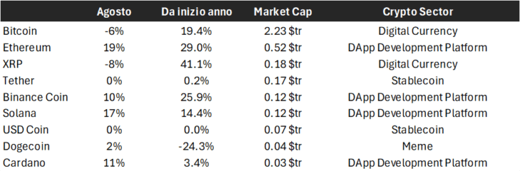 Il mese di agosto ha messo in luce un andamento eterogeneo all’interno del mercato delle criptovalute, una dinamica che negli ultimi anni sembra essersi consolidata come caratteristica strutturale del comparto. In questo contesto, Ethereum ha sovraperformato Bitcoin, sostenuto da consistenti flussi istituzionali e da un rinnovato interesse verso gli asset legati allo sviluppo delle infrastrutture digitali.