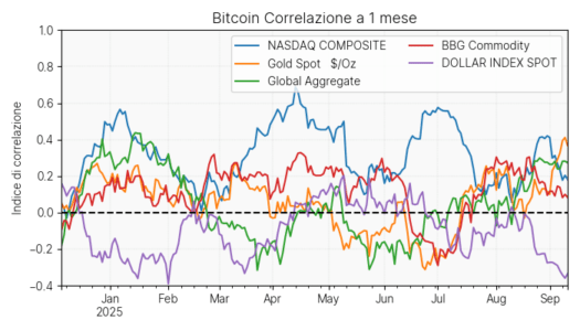 Sul fronte delle correlazioni, Bitcoin continua a distinguersi per il suo profilo peculiare rispetto alle altre asset class. Dopo un periodo in cui il suo andamento era risultato fortemente legato ad asset a elevata componente speculativa, come il Nasdaq, questa connessione si è via via attenuata. Parallelamente, si è registrato un aumento della correlazione con l’oro, un trend che, se consolidato, potrebbe riflettere la crescente percezione del Bitcoin come potenziale riserva di valore e componente utile alla diversificazione all’interno di un portafoglio multi-asset.