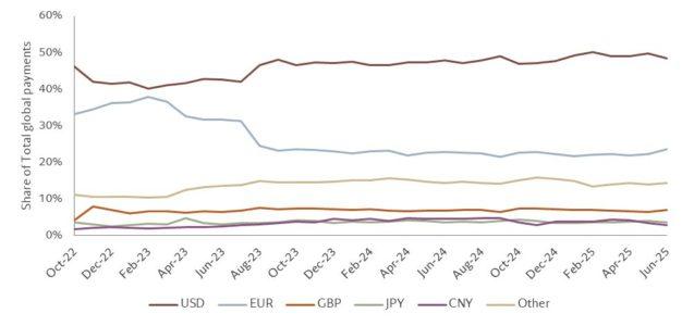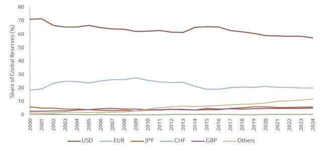 Tutti gli altri indicatori mostrano come l’importanza del dollaro sia invece aumentata nel tempo. La percentuale dei pagamenti globali registrati in dollari è passata dal 46% del 2022 al 49% del 2024; la percentuale globale di debito denominata in dollari dal minimo del 2008 del 29% è tornata al 47% nel 2024; infine, la percentuale di transazioni nel mercato valutario in dollari è rimasta sempre stabile al 45% (essendoci due leg nelle transazioni in valute, la percentuale riportata è una divisione per 2 del valore nominale).