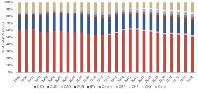 Guardando l’evoluzione nel tempo delle singole metriche (Fig. 2) si può notare come solamente la percentuale di dollari utilizzata come riserva sia diminuita nel tempo, passando dal 71% del 2000 al 57% del 2024, a seguito del graduale aumento dell’utilizzo di altre valute e non a causa dell’aumento dell’utilizzo di una singola valuta. Le riserve stanno fluendo verso valute come il dollaro canadese, il dollaro australiano e il renminbi cinese. A parte la Cina, queste sono le valute di paesi stabili con economie forti e stretti rapporti con gli Stati Uniti. Lo spostamento dal dollaro è stato marcato soprattutto nei Paesi preoccupati per l’egemonia del dollaro e per le sanzioni finanziarie statunitensi, come Russia e Cina. Qui, le banche centrali hanno anche aumentato le loro riserve in oro, passate dal 9% nel 2014 al 14% nel 2024.
