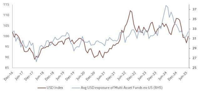 Un’altra metrica interessante è come varia l’esposizione media al dollaro dei fondi real money nel tempo e come si relaziona al tasso di cambio del dollaro. Analizzando i dati mensili raccolti dal 2016 (su esposizione USD dei fondi multi-asset attivi con base currency diversa dal dollaro e domiciliati fuori dagli USA), emerge un trend di crescita dell’esposizione media in dollari nel medio periodo. Questo riflette la continua preferenza degli investitori globali per asset denominati in dollari.