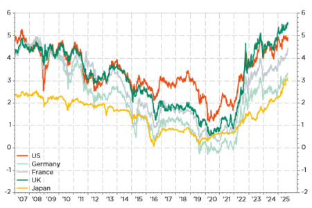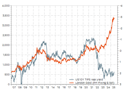 Le sorti dell’oro e dei titoli di Stato a lungo termine hanno registrato un andamento significativamente diverso negli ultimi trimestri, dato che i rendimenti dei titoli di Stato dei mercati sviluppati a lunga scadenza hanno raggiunto livelli mai visti da decenni, mentre l’ascesa del prezzo dell’oro ha subito un’accelerazione dal 2024. Considerando i due decenni precedenti, ci si sarebbe aspettati una correlazione negativa tra tassi a lungo termine e prezzi dell’oro.