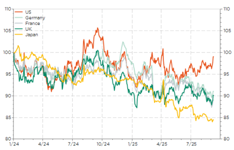 Di sicuro, i titoli del Tesoro USA quest’anno non hanno subito un calo così netto come i titoli europei o giapponesi, in gran parte perché l’economia statunitense sta rallentando, la Fed riprenderà presto ad allentare la politica monetaria, le cedole USA sono più alte (minore sensibilità dei prezzi alle variazioni dei tassi) e… anche il biglietto verde sta assorbendo gran parte dell’aggiustamento al ribasso (l’USD ha perso circa il 10% da inizio anno rispetto alla maggior parte delle altre valute dei mercati sviluppati).