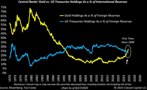Con il prezzo dell’oro attualmente superiore a 3.600 dollari, le riserve auree delle banche centrali valgono ora oltre 4.500 miliardi di dollari, rispetto ai 3.500 miliardi di dollari di titoli del Tesoro USA detenuti da banche centrali estere (esclusa la Fed, che da sola detiene circa 4.200 miliardi di dollari di titoli del Tesoro). Le riserve auree, come valore delle riserve estere (in USD), hanno quindi beneficiato sia dell’effetto prezzo dopo il picco di inflazione post-pandemia, sia di un significativo aumento della domanda dopo l’invasione dell’Ucraina da parte della Russia alla fine di febbraio 2022. Hanno aumentato le loro riserve di oltre 1.000 tonnellate in ciascuno degli ultimi tre anni, un ritmo record e il doppio della media degli acquisti annuali del decennio precedente…