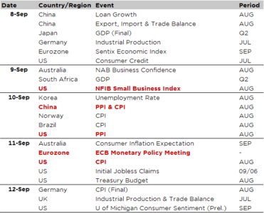Infine, mercoledì saranno pubblicati anche i dati sull’inflazione in Cina, con la lettura dei dati PPI e CPI di agosto. L’attenzione sarà rivolta al primo dato, punto di osservazione chiave per valutare i progressi negli sforzi “anti-involutivi” (si veda la nostra nota settimanale del 18 agosto , ” Parliamo di deflazione! “): il consenso prevede un dato del -2,9% su base annua, in aumento rispetto al -3,6% di luglio, mentre l’inflazione dei prezzi al consumo è prevista in territorio negativo con un -0,2% su base annua (rispetto allo 0% di luglio).