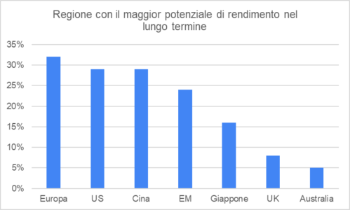 Più americano-centrici, invece, gli investitori retail a livello globale, che stanno gradualmente ridando fiducia all’equity Usa. Per il 38%, infatti, saranno ancora gli Stati Uniti e guidare le performance, seguiti dall’Europa (28%) e dalla Cina (26%).