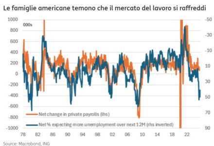 Per ora i dati rimangono coerenti con l’opinione che il mercato del lavoro si stia raffreddando, ma non collassando. I lavoratori, tuttavia, sono certamente preoccupati. Uno dei parametri chiave per dimostrarlo è l’indice di fiducia dei consumatori dell’Università del Michigan. In quel rapporto c’è una domanda sulla disoccupazione. Attualmente il 62% degli americani ritiene che la disoccupazione aumenterà nei prossimi 12 mesi, mentre solo il 13% pensa che diminuirà. Questo porta a un valore netto del 49% che prevede un aumento della disoccupazione. Abbiamo visto valori peggiori solo in quattro occasioni negli ultimi 50 anni circa, come si vede nel grafico sottostante. Le persone vedono e percepiscono i cambiamenti nel mercato del lavoro prima che si manifestino nei dati ufficiali: sanno se la loro azienda ha un blocco delle assunzioni o se qualche persona qua e là viene licenziata. Questo suggerisce la reale minaccia di un calo netto dell’occupazione entro la fine dell’anno.
