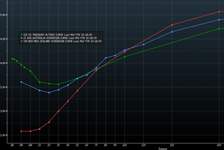 Curve dei rendimenti dei titoli del Tesoro USA, dei titoli di Stato di Australia e Nuova Zelanda