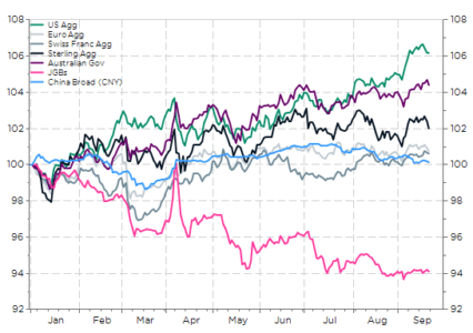 Investire in JGB (titoli di Stato giapponesi) è probabilmente una questione più controversa, soprattutto perché quest’anno si è rivelata una pessima idea, con i JGB che hanno registrato una significativa sottoperformance – in valuta locale – nel mercato obbligazionario sovrano globale. Tuttavia, come tutti sapete, le performance passate non sono indicative di quelle future … soprattutto nell’universo obbligazionario, dove rendimenti o tassi più elevati dovrebbero tradursi in rendimenti migliori in futuro (escludendo ovviamente i default).