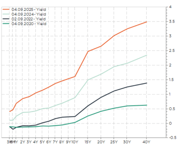 In primo luogo, i tassi giapponesi a 10 anni sono aumentati e ora si attestano intorno all’1,6%, un livello mai visto dal 2008. Inoltre, l’aumento è stato ancora più spettacolare per le scadenze più lunghe, determinando la curva dei rendimenti più ripida tra i mercati sviluppati. In altre parole, i JGB offrono il miglior rapporto qualità-prezzo tra i titoli sovrani.