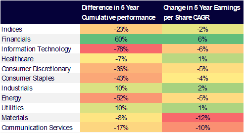 Nel 2025 l’Europa è tornata alla ribalta. Grazie al calo dei costi energetici e all’allentamento delle regole di bilancio in Germania, otto dei mercati azionari con le performance migliori a livello mondiale erano europei. Negli ultimi cinque anni gli Stati Uniti hanno sovraperformato l’Europa di quasi il 23,5% in termini di USD grazie alla maggiore crescita degli utili. Nell’arco di cinque anni, i titoli finanziari hanno registrato un tasso di crescita degli utili composto pari al 9%, tre volte superiore a quello delle banche statunitensi, mentre i settori orientati al mercato interno, ovvero servizi pubblici, industriali e materiali, hanno sovraperformato i pesi massimi delle esportazioni.