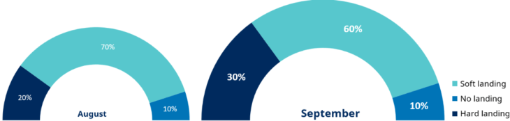 Mentre ci avviciniamo all’ultimo trimestre del 2025, continuiamo a ritenere che un atterraggio morbido sia l’esito più probabile, con una probabilità del 60%. Tuttavia, ma permangono rischi in senso sfavorevole: c’è una probabilità del 30% di un atterraggio duro e del 10% di uno scenario di ‘no landing’.