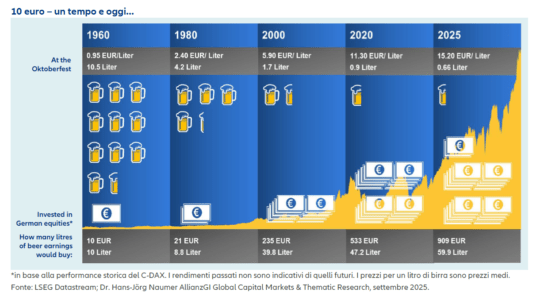 - Immaginiamo che nel 1960 qualcuno sia stato tanto lungimirante da investire 20 marchi (DM) in un ampio paniere di azioni tedesche (C-DAX), in previsione delle future edizioni dell’Oktoberfest, e che abbia reinvestito tutti i guadagni ottenuti nel tempo. • Quei 20 marchi si sarebbero trasformati in 909 euro nell’ottobre 2025, un risultato che avrebbe battuto qualsiasi inflazione del prezzo della birra. Considerando il costo di 15,20 euro al litro dell’Oktoberfest di quest’anno, si sarebbero potuti acquistare ben 60 litri.