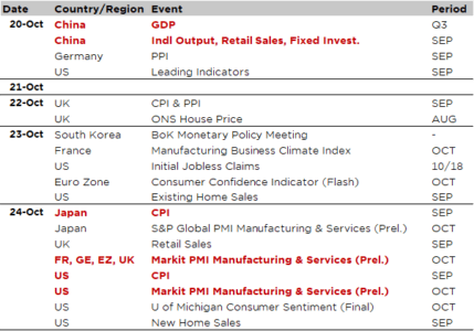 I dati macroeconomici torneranno in primo piano questa settimana, che si preannuncia ricca di eventi, con il PIL cinese del terzo trimestre e i dati sull’attività di settembre (vendite al dettaglio, produzione industriale e investimenti), attesi lunedì (maggiori dettagli di seguito), gli indici PMI globali flash di ottobre venerdì e la lettura ritardata e quindi molto attesa dell’indice dei prezzi al consumo (CPI) statunitense di settembre, prevista nello stesso giorno. Il consenso prevede un +0,4% su base mensile per l’indice headline e +0,3% per il core, che porteranno entrambi i tassi di inflazione annua statunitensi al di sopra del 3%. Tra gli altri dati macro di rilievo figurano l’indice dei prezzi al consumo del Regno Unito (mercoledì), per verificare se l’inflazione britannica riuscirà a stabilizzarsi (inflazione annua headline e core previste rispettivamente al 4,0% e al 3,7%) dopo mesi di tendenza al rialzo sulla scia di un’inflazione vischiosa nei servizi (vicina al 5%), nonché l’ indice dei prezzi al consumo del Giapponese (venerdì), fondamentale per valutare il ritmo di inasprimento della politica monetaria della BoJ. Il consenso prevede un aumento del tasso di inflazione annuale giapponese al 2,9% a settembre, rispetto al 2,7% del mese precedente.