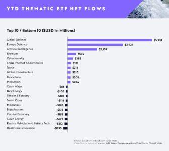 Allargando lo sguardo a tutto il 2025 finora, i flussi netti complessivi sugli ETF tematici ammontano a +13,1 miliardi di dollari. Gli ETF sulla Difesa Globale guidano la classifica con +5,93 miliardi di dollari; seguono gli ETF sulla Difesa Europea con +3,92 miliardi di dollari. Gli ETF sull’Intelligenza Artificiale restano al terzo posto con +2,11 miliardi di dollari.