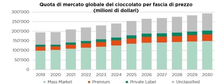 L’indulgenza consapevole continua a guadagnare terreno e i produttori di cioccolato premium ne beneficeranno, mentre i concorrenti del mercato di massa subiscono gli effetti della mancanza di potere decisionale in termini di prezzo e personalizzazione del prodotto. Oggi i consumatori sono disposti a pagare di più per un prodotto che li faccia sentire speciali, che offra un gusto nuovo ed esperienze multisensoriali oltre all’indulgenza emotiva, più in linea con i loro valori etici e le loro esigenze pratiche e di salute. Di conseguenza il segmento premium, che rappresenta circa il 10% del volume globale del mercato del cioccolato e il 25% del suo valore, sta crescendo a un ritmo più rapido (+5%-7% annuo entro il 2030) e genera rendimenti superiori grazie al migliore spread tra prezzo e costo del cacao.