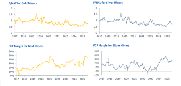 Per quanto riguarda i titoli delle società aurifere e argentifere, anche le loro azioni hanno registrato un forte rialzo quest’anno, partendo però da una base molto bassa. L’ETF Van Eck Gold Miners è salito del 125% da inizio anno fino a settembre. Tuttavia, a mio avviso, le valutazioni dei titoli minerari rimangono modeste, con le azioni ancora al di sotto delle loro medie di lungo periodo in base al price-to-cash-flow e al price-to-NAV.