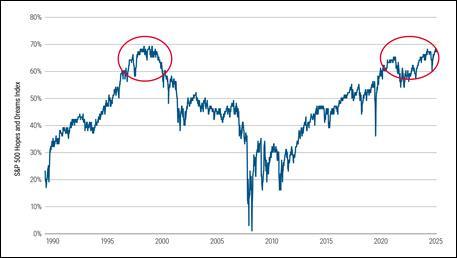 Fonte: dati Bloomberg ed elaborazioni PIMCO ad agosto 2025. L’indice S&P Hopes and Dreams, calcolato da Cameron Crise di Bloomberg, traccia la percentuale residua del valore di mercato non spiegata dal valore contabile e dal valore attuale netto delle stime degli utili dei prossimi tre anni delle società. I rendimenti passati non sono una garanzia né un indicatore affidabile dei risultati futuri