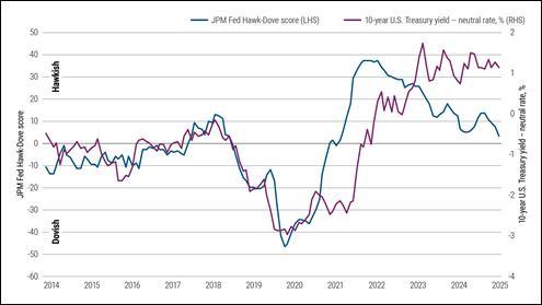 Ma mentre i mercati azionari sembrano ottimisti e le aspettative di inflazione appaiono stabili per ora, il J.P. Morgan Hawk-Dove Score suggerisce una certa cautela tra gli investitori obbligazionari. La differenza tra i rendimenti dei Treasury a 10 anni e il tasso neutrale nominale è salita al di sopra dei livelli segnalati nelle comunicazioni della Fed. Questo divario suggerisce che il mercato sta scontando un rischio maggiore a lungo termine. Ciò potrebbe esercitare una pressione al rialzo sui tassi di interesse a lungo termine. Segnala inoltre un’elevata incertezza riguardo all’inflazione e alla crescita future.