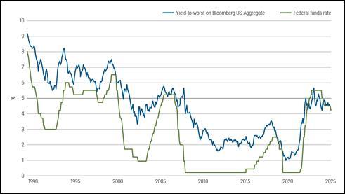 Fonte: Federal Reserve statunitense e Bloomberg, dati aggiornati a settembre 2025. Lo Yield-to-worst è il rendimento potenziale più basso stimato che può essere ottenuto su un’obbligazione senza che l’emittente sia effettivamente in default. I rendimenti passati non sono una garanzia né un indicatore affidabile dei risultati futuri.