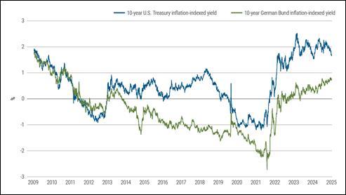 Al di là degli Stati Uniti, un altro trend di lungo periodo è tornato durante il periodo di ripresa post-pandemia: il rendimento dei Bund tedeschi indicizzati all’inflazione a 10 anni (o “linker”) è rimasto in territorio positivo per quasi due anni, dopo oltre un decennio sotto lo zero. I rendimenti dei linker sono ancora significativamente inferiori ai rendimenti indicizzati all’inflazione dei Treasury protetti dall’inflazione (TIPS). I rendimenti dei TIPS si aggirano intorno al 2% dal 2023, ma in precedenza erano stati inferiori, persino negativi, nel contesto di bassa inflazione che ha seguito la crisi finanziaria globale. I rendimenti più elevati dei titoli indicizzati all’inflazione sono un altro segnale che il reddito fisso può essere un investimento interessante e consapevole del rischio nell’attuale contesto macroeconomico incerto.