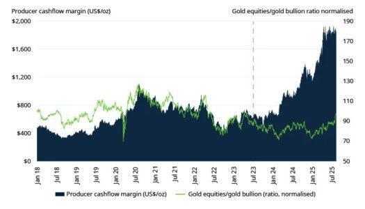 Il margine di sovraperformance delle azioni aurifere rispetto all’oro fisico rimane sostanziale. Rispetto ai prezzi dell’oro fisico, le azioni aurifere dovrebbero sovraperformare di un ulteriore 30% per tornare ai livelli del 2020. Tuttavia, i margini sono oggi raddoppiati rispetto ad allora. Inoltre, i bilanci dei produttori sono molto più solidi e i rendimenti per gli azionisti tramite riacquisti e dividendi sono più elevati.