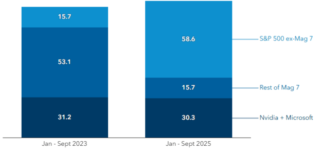 Fonte: FactSet. Il resto dei Magnifici 7 comprende Alphabet, Amazon, Apple, Meta e Tesla. I titoli dell’S&P 500 esclusi i “Magnifici 7” rappresentano le altre 493 società dell’indice. Dati al 30 settembre 2025.