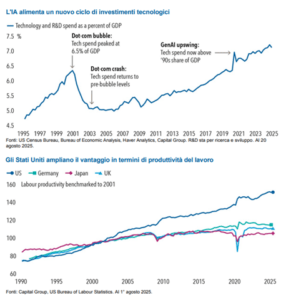 Gli Stati Uniti si trovano a un bivio. La crescita sta rallentando poiché le politiche tariffarie incidono negativamente sulle assunzioni e frenano la spesa dei consumatori. D’altra parte, l’intelligenza artificiale generativa (AI) sta determinando un aumento della produttività. La domanda è: l’AI può colmare le lacune dell’economia? Riteniamo che, sebbene le restrizioni commerciali rappresentino un ostacolo reale, l’AI potrebbe costituire un vantaggio strutturale in grado di accelerare la crescita nel 2026-27.