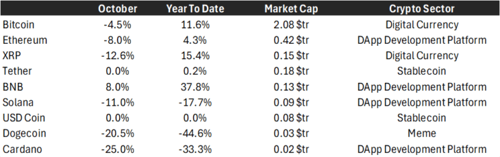 Un crollo aggravato da una serie di guasti sistemici nelle infrastrutture dei mercati crypto, tra cui il blocco del motore di trading su Binance, che hanno pressoché annullato i guadagni accumulati nel corso del 2025: Bitcoin ha chiuso ottobre in calo del 4%, mentre Ethereum ha perso l’8%. I settori più rischiosi sono stati decimati, con l’indice MarketVector Decentralized Finance Leaders che è crollato del 21,84% e il Meme Coin Index del 18,24%. Binance Coin (BNB) ha registrato una performance positiva, ma contraddistinta da una volatilità estrema, con una rapida successione di rialzi e ribassi del ±15% circa.