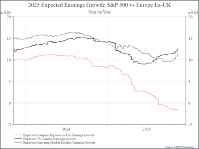 Va ricordato che un simile andamento ha avuto luogo in un contesto di marcato rallentamento delle aspettative sugli utili europei: mentre le previsioni di crescita di Stati Uniti e Mercati Emergenti sono rimaste solide, quelle relative all’Europa – Regno Unito escluso – si sono ridotte sensibilmente col passare dei mesi. Nel complesso, gli utili attesi per il 2025 appaiono destinati a mantenersi su livelli sovrapponibili al 2024 e la performance europea può essere considerata migliore del previsto
