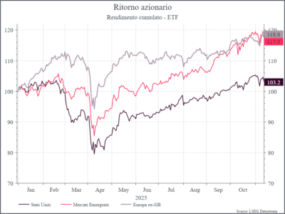 Finora, dall’inizio dell’anno, l’azionario europeo ha registrato risultati piuttosto solidi. Nel corso del primo semestre, gli Stati Uniti hanno mostrato una performance più debole rispetto a Regno Unito, Europa e Mercati Emergenti, risentendo dei timori legati al rallentamento della crescita e all’impatto di dazi più elevati. Tra Europa e Mercati Emergenti, invece, non si sono osservate differenze significative. Nella seconda metà dell’anno, però, il Vecchio Continente ha perso terreno rispetto agli States e ai Mercati Emergenti, anche se, con un rendimento superiore al 7% (in euro), il bilancio resta comunque positivo.