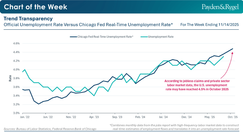 La scorsa settimana negli Usa si è concluso, dopo 43 giorni, il più lungo shutdown della storia. Per i mercati finanziari, la riapertura implica che i principali dati su mercato del lavoro e inflazione torneranno disponibili, contribuendo a dissipare la “nebbia informativa” che ha limitato la capacità di analisi dei policymaker. Secondo Kevin Hassett, direttore del National Economic Council, però, il dato ufficiale sulla disoccupazione di ottobre potrebbe non essere pubblicato, dal momento che il Bureau of Labor Statistics è rimasto chiuso durante il periodo di raccolta dei dati. Nonostante questo, la presenza di indicatori alternativi consente comunque di formulare valutazioni attendibili. In particolare, la stima in tempo reale della Federal Reserve di Chicago combina le richieste ufficiali di sussidi di disoccupazione con dati ad alta frequenza provenienti dal settore privato — tra cui le offerte di lavoro di Indeed, i rilevamenti occupazionali ADP e altre indagini — per elaborare una proiezione aggiornata del tasso di disoccupazione. Sulla base di tale modello, il tasso di disoccupazione potrebbe aver raggiunto il 4,5% in ottobre, con un incremento di circa mezzo punto percentuale rispetto al minimo dei dodici mesi precedenti, un livello che storicamente ha spesso anticipato l’avvio di una fase recessiva. Indipendentemente dal rilascio dei dati ufficiali prima dell’ultima riunione della Fed del 2025, ad oggi il bilancio dei rischi sembra continuare a favorire un orientamento più accomodante della politica monetaria.