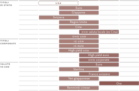 La nostra decisione riceve ulteriore sostegno dal fatto che i Treasury appaiono costosi rispetto ai recenti trend di crescita nominale. I rendimenti dei titoli di Stato a lungo termine e la crescita nominale tendono ampiamente ad allinearsi; tuttavia, l’attuale rendimento del 4% per i Treasury a 10 anni è ben inferiore all’attuale tasso di crescita nominale dell’economia statunitense, che, secondo le analisi, si avvicina al 5%. Nel frattempo, gli spread di credito sono ai minimi del ciclo e il rendimento aggiuntivo offerto agli investitori è troppo limitato per compensare i potenziali shock di mercato. Finora, tuttavia, veri e propri segnali di stress si sono mostrati solo nel mercato del credito privato, innescando brevi episodi di volatilità nei mercati pubblici. In ogni caso, continuiamo a sovrappesare le obbligazioni high yield dell’eurozona grazie ai loro rendimenti rettificati per la volatilità, più interessanti rispetto alle controparti statunitensi. Sebbene le valute dei mercati emergenti siano meno convenienti rispetto al passato, c’è ancora valore in questa parte del mercato: in America Latina i rendimenti reali si assestano tra il 5 e il 10%. I fondamentali economici delle economie in via di sviluppo rimangono favorevoli: la crescita si sta dimostrando più resiliente che non nelle economie sviluppate, i tassi di inflazione sono in calo e la debolezza del dollaro resta un forte vento a favore. Tutti dati a sostegno del nostro sovrappeso del debito in valuta locale dei mercati emergenti (Cina esclusa) e del credito societario dei mercati emergenti. Prevediamo un ulteriore deprezzamento del dollaro e, di conseguenza, continuiamo a sovrappesare euro e franco svizzero.