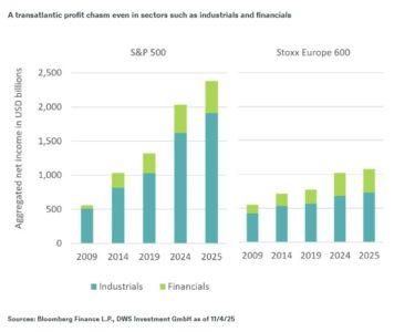 Naturalmente, la composizione degli indici spiega gran parte di questa differenza. Il motore dei profitti dell’S&P 500 è alimentato da un gruppo ristretto di colossi tecnologici e delle comunicazioni statunitensi. Le prime 10 aziende rappresentano oggi il 32% del reddito netto totale, rispetto al 24% del 2009, segno di una concentrazione record. Le prime 10 aziende europee partivano da un peso simile nel 2009, ma oggi rappresentano solo il 16% dei profitti. A prima vista, questo può sembrare uno svantaggio, ma può anche indicare maggiore resilienza. Tuttavia, anche considerando settori più tradizionali, come industria e finanza, il divario resta ampio.