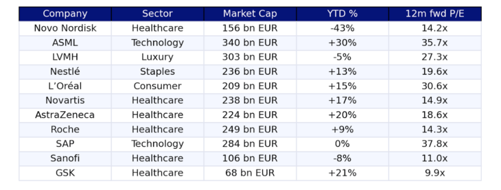 Il termine GRANOLAS è stato coniato da Goldman Sachs per descrivere undici leader europei: GSK, Roche, ASML, Nestlé, Novartis, Novo Nordisk, L’Oréal, LVMH, AstraZeneca, SAP e Sanofi. Queste aziende rappresentano il meglio della qualità europea: margini solidi, ritorni elevati sul capitale e una presenza globale capillare. Pesano negli indici perché sono aziende grandi e molto scambiate.