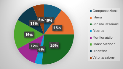 Le tipologie di intervento sono prevalentemente di sensibilizzazione (26%), di conservazione (16%, in particolare la protezione diretta degli habitat impattati dalle attività aziendali), di monitoraggio ambientale (12%) e di ripristino degli ecosistemi (11%). Le azioni lungo la filiera (15%) e le attività di compensazione (10%) risultano spesso meno impegnative in termini economici e gestionali, ma garantiscono ritorni reputazionali immediati. Decisamente più raro è invece il coinvolgimento delle corporate nelle iniziative di valorizzazione della biodiversità (6%) e nei progetti di ricerca scientifica (4%). Le imprese privilegiano interventi “quick-win”, efficaci sul piano comunicativo e reputazionale, ma spesso limitati in termini di impatto trasformativo.
