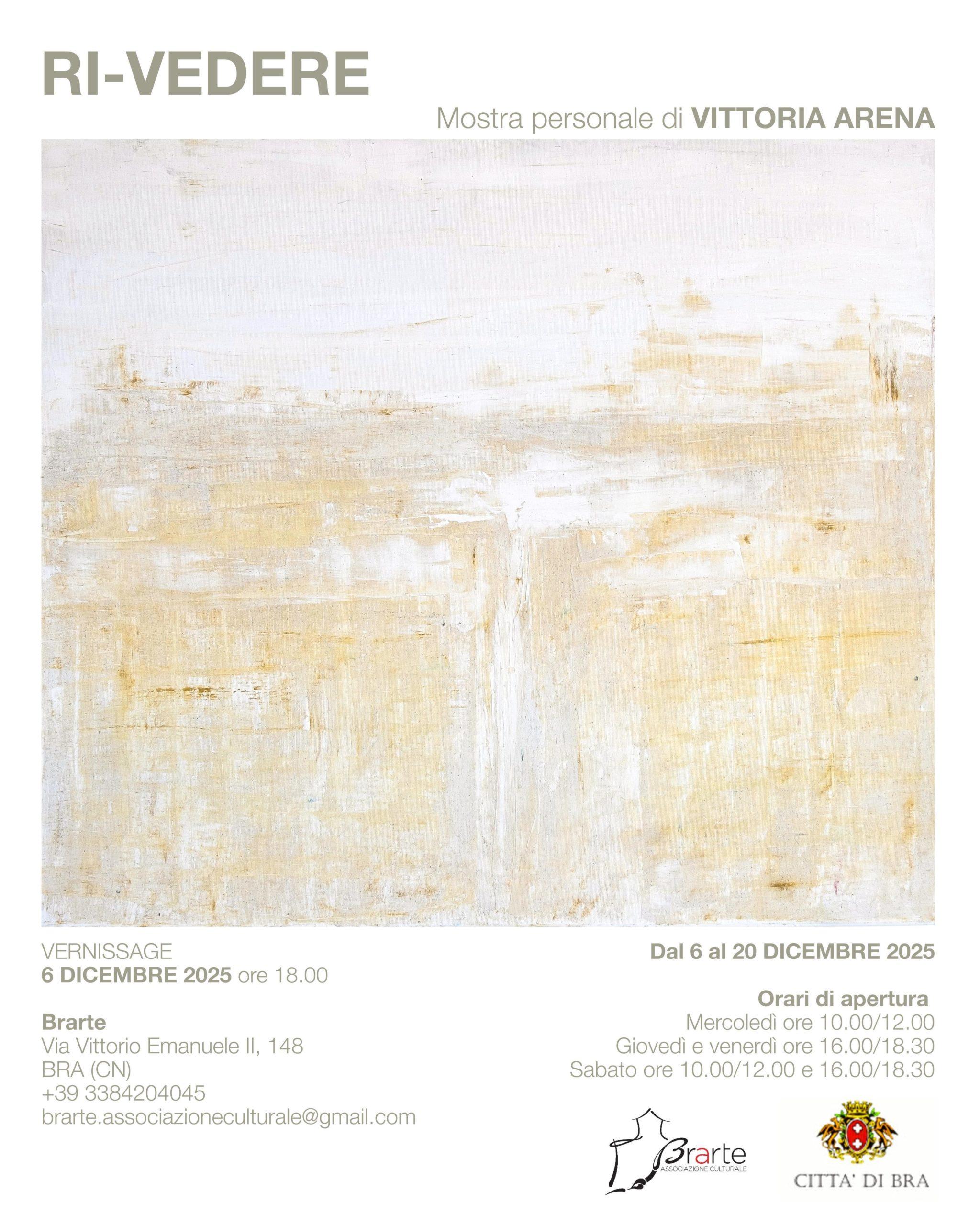 Bra si prepara ad accogliere Ri-Vedere, la nuova mostra personale di Vittoria Arena, che sarà inaugurata sabato 6 dicembre presso l’associazione culturale BrArte. Un appuntamento che aprirà l’ultimo mese dell’anno all’insegna del colore, della memoria e della visione interiore.