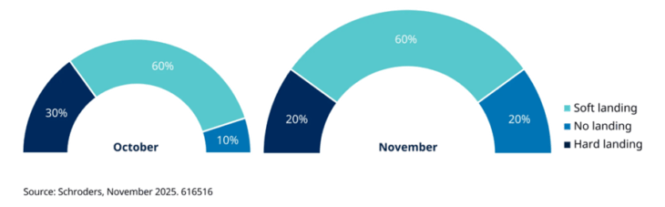 Un soft landing continua a rappresentare lo scenario con la probabilità più elevata (60%). Tuttavia, ora attribuiamo un peso equivalente ai rischi di no landing e di hard landing, mentre in precedenza eravamo leggermente sbilanciati verso quest’ultimo. Questo cambiamento riflette principalmente le nostre attese che i dati statunitensi, una volta pubblicati, si manterranno solidi nel breve termine.