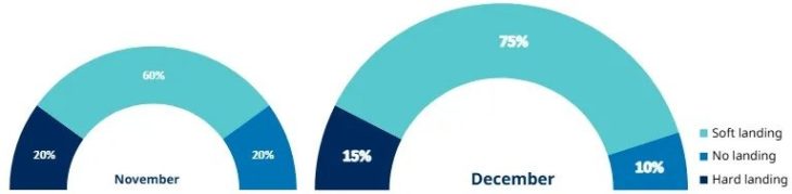 Abbiamo aumentato la probabilità di un “atterraggio morbido”, che a nostro avviso è di gran lunga l’esito più probabile. La possibilità di un “atterraggio duro” è stata ridotta, riflettendo i timidi segnali di stabilizzazione di alcuni indicatori del mercato del lavoro, come le intenzioni di assunzione delle piccole imprese.