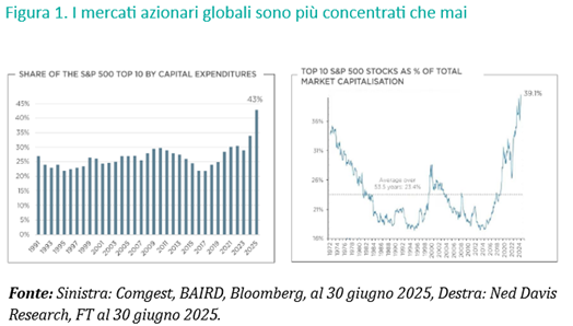 Questo entusiasmo ha contribuito a spingere alcune aziende del settore tecnologico statunitense a valutazioni record. [nota 6] In un contesto simile, è forte la tentazione di considerare tutte le aziende legate all’IA come parte dello stesso settore. Alcuni investitori sembrano convinti che l’IA trasformerà ogni settore, mentre altri la considerano una tendenza costruita su basi instabili. Nel frattempo, la crescente concentrazione all’interno degli indici globali ha incoraggiato sia i flussi passivi che quelli al dettaglio verso un numero ristretto di vincitori a grande capitalizzazione (in particolare i titoli tecnologici statunitensi), rafforzando lo slancio dei principali contributori.