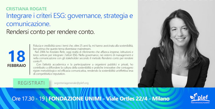 L’incontro del 18 febbraio (ore 17.30), ospitato presso Fondazione UNIMI (V.le Ortles 22/4, Milano), nasce con l’obiettivo di offrire una chiave di lettura concreta su questi temi, mettendo al centro il rapporto tra metodo, strategia e comunicazione. Attraverso l’esperienza e il percorso professionale di Cristiana Rogate, socia PLEF, verrà esplorato il significato profondo del “rendersi conto per rendere conto”: un approccio che coniuga rigore metodologico, integrazione dei fattori ESG e capacità di trasformare la sostenibilità in una leva reale di competitività e reputazione.