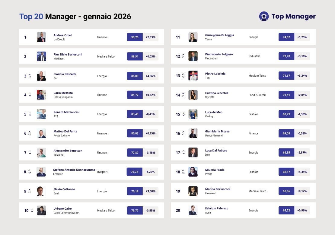 All’undicesimo stabile l’AD di Terna Giuseppina Di Foggia (74.67), seguita al dodicesimo da Pierroberto Folgiero (73.78) che sale di uno con Fincantieri, tra i protagonisti industriali nella partita delle rotte artiche. Al tredicesimo sale di tre Pietro Labriola (71.67), AD di Tim che vive il suo momentum in borsa sfiorando i 12 miliardi di capitalizzazione. Guadagna una posizione l’AD di Illycaffè Cristina Scocchia (71.11), che chiude il 2025 con un +10% di fatturato nonostante l’incremento del 50% dei costi sulla materia prima. Quindicesimo Luca de Meo (69.79). Al sedicesimo sale di uno l’AD di Banca Generali Gian Maria Mossa (69.08) con risultati 2025 oltre le attese. Diciassettesimo Luca Dal Fabbro (68.35), al diciottesimo Miuccia Prada (68.17) con le nuove collezioni fa un balzo di quattro. Chiudono la top 20: Marina Berlusconi (67.06) e Fabrizio Palermo (65.72). In Top 200 in crescita: Renzo Rosso (24°,+4); Massimiliano DI Silvestre (26°,+8); Sabrina De Filippis (35°,+4); Ermenegildo Zegna (57°,+7); Vinicio Mosè Vigilante (100°,+34); Aldo Bisio (121°,+26).