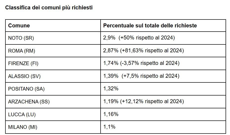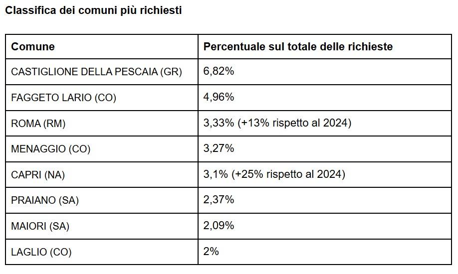 L’analisi comunale evidenzia una domanda fortemente concentrata in località di alto profilo paesaggistico e culturale. Tra le destinazioni più richieste figurano Castiglione della Pescaia, Faggeto Lario, Roma, Menaggio e Capri, insieme ad altre località della Costiera Amalfitana e del sistema lariano. Il profilo di queste destinazioni conferma un modello di domanda che privilegia contesti iconici ma abitabili, con forte valore paesaggistico e alta qualità della vita.