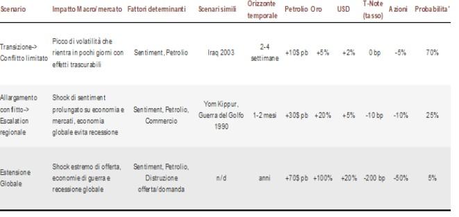 Nella tabella riassumiamo il ventaglio degli scenari possibili con le implicazioni di mercato, cercando di stimare le probabilità di questi scenari. È giusto ricordare come, a seguito dell’annuncio di Trump dell’invio di un sostanzioso contingente militare nella regione, i mercati avessero iniziato ad anticipare la possibilità di un conflitto, come evidente dal movimento delle ultime settimane di petrolio, oro e tassi di interesse.