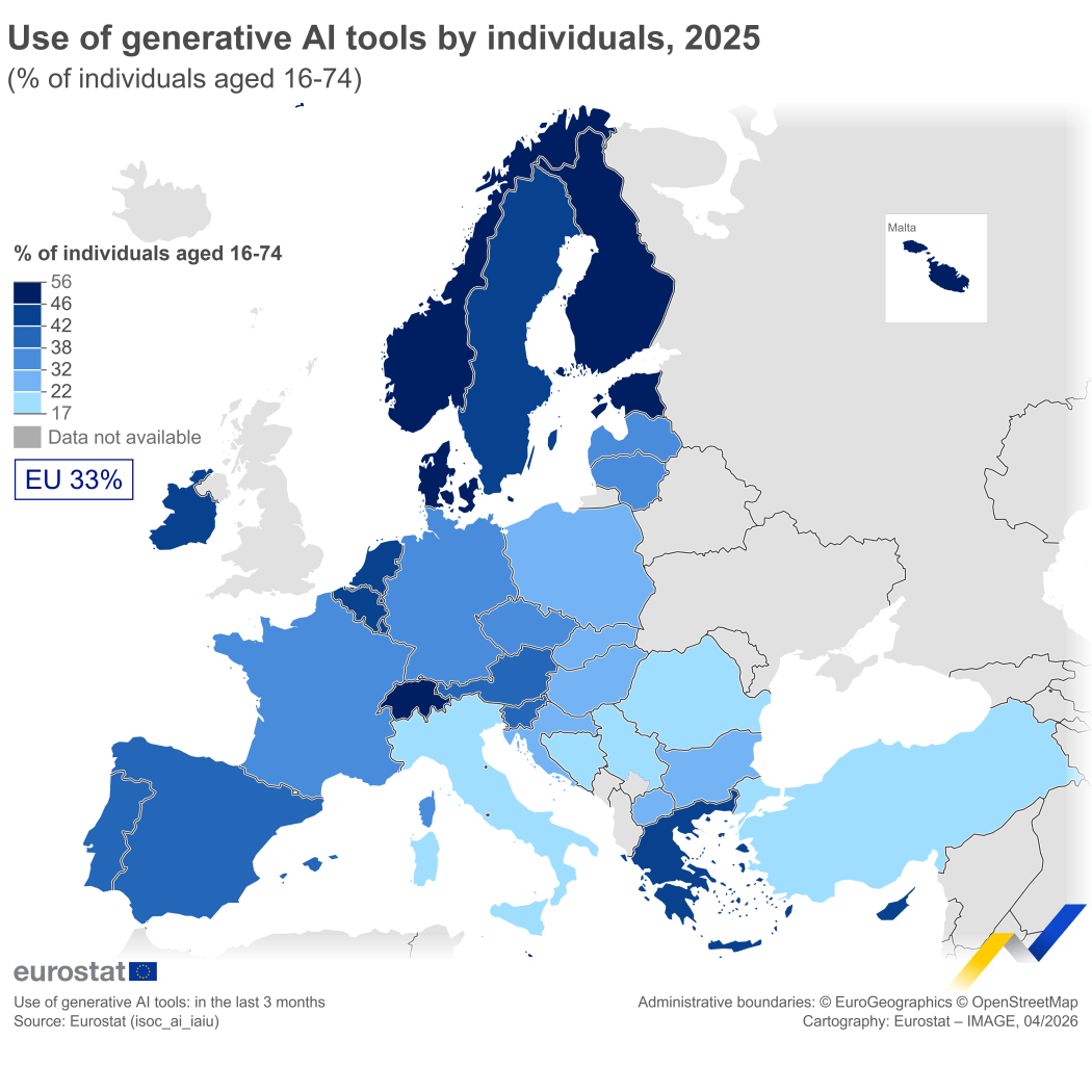 Nel 2025, un terzo delle persone intervistate nell’UE aveva utilizzato strumenti di intelligenza artificiale generativa nei tre mesi precedenti; i tassi più elevati si sono registrati in Danimarca (48%), Estonia e Malta (entrambe al 47%) e Finlandia (46%).