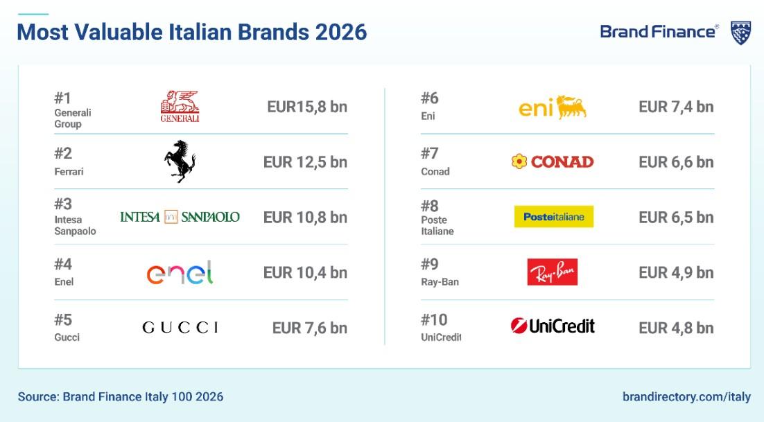 Tre comparti guidano la crescita nel 2026. Le banche registrano i risultati più vivaci: Intesa Sanpaolo cresce dell’11% a 10,8 miliardi di euro (3° posto assoluto), Unicredit del 16% risalendo dal 14° al 10° posto. Il food accelera grazie ai brand del Gruppo Ferrero, Gruppo Veronesi (Aia, Negroni e Veronesi) e Parmalat — confermando che investire in brand autonomi e riconoscibili produce rendimenti misurabili nel tempo. Enel cresce del 9% a 10,4 miliardi di euro (4° posto).