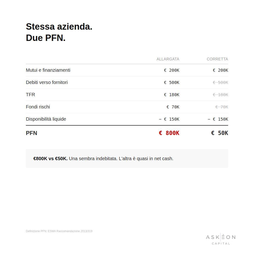 Stesso bilancio. PFN €550K con la definizione bancaria. €50K con la definizione ESMA.