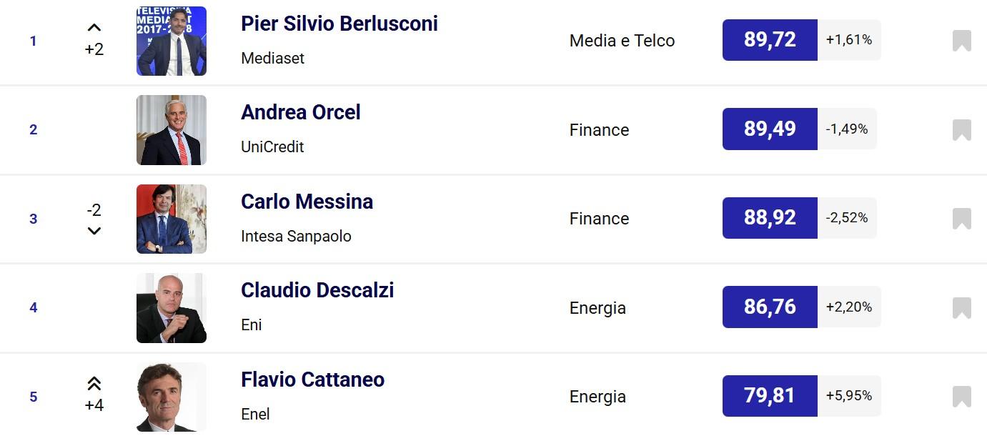 Stabile al secondo l’AD di Unicredit Andrea Orcel (89.49) che estende la sua azione su Commerzbank con una ops per superare il 30% di quote. Il Governo tedesco si oppone, ma il manager non è solito arretrare. Terzo Carlo Messina (88.92), AD di Intesa Sanpaolo che si conferma “Best Investment Bank” secondo Global Finance per il sesto anno consecutivo. Quarto l’AD di Eni Claudio Descalzi (86.76), con utile del quarto trimestre che balza a 1,2 miliardi (+35%) mentre con la guerra in Medio Oriente il petrolio è al centro di una crisi globale. Scala quattro posizioni fino alla quinta Flavio Cattaneo (79.81) che al Capital Market Day rivendica il raggiungimento dei risultati promessi, con una capitalizzazione di mercato cresciuta del 50% e un nuovo piano da 53 miliardi di investimenti. Al sesto arriva in volata Matteo Del Fante (79.13), che sta tentando la scalata in TIM e ha condotto Poste a utili record con 13,1 miliardi di ricavi. Settimo l’AD di A2A Renato Mazzoncini (79.08), ottavo Stefano Donnarumma (76.88) di FS, nono il Presidente di Edizione Alessandro Benetton (76.82). Al decimo Giuseppina Di Foggia (75.86), AD di Terna. All’undicesimo sale di due Pietro Labriola (74.49), grazie a risultati di TIM sopra le attese, seguito da Pierroberto Folgiero (72.71) e Urbano Cairo (72.43). Al quattordicesimo sale di cinque Fabrizio Palermo (71.81) tra la candidatura alla futura guida di MPS e il record di +45% dei profitti 2025 di Acea. Quindicesimo Luca Dal Fabbro (70.53), Presidente di Iren che ottiene dalla BEI 225 milioni per promuovere l’economia circolare e l’efficienza energetica. Luca de Meo (70.26) stabile al sedicesimo.
